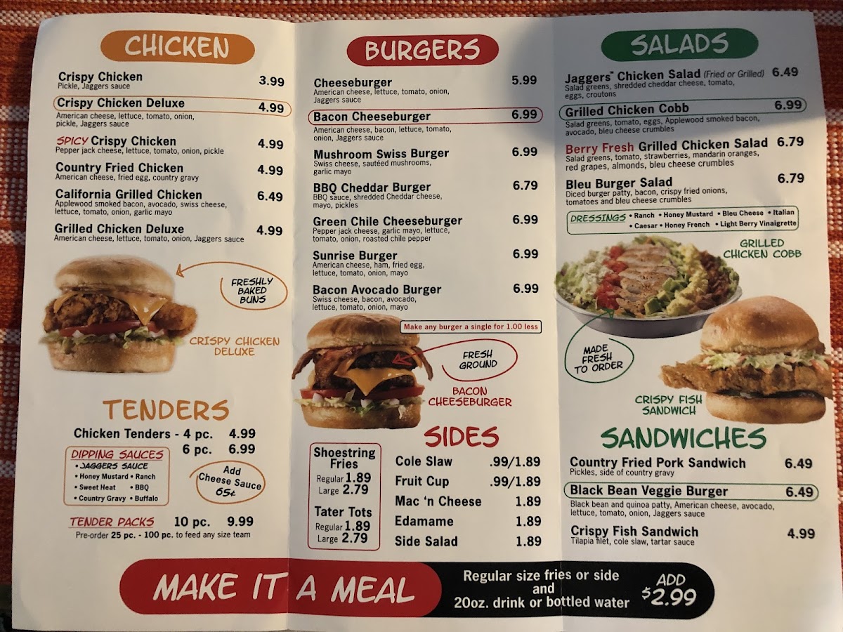 Black bean and quinoa patty, American cheese, avocado, lettuce, tomato, onion, Jaggers sauce